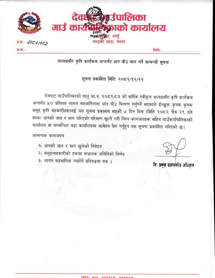 अध्यक्षसँग कृषि कार्यक्रम अन्तर्गत धान बीउ माग गर्ने सम्बन्धी सूचना