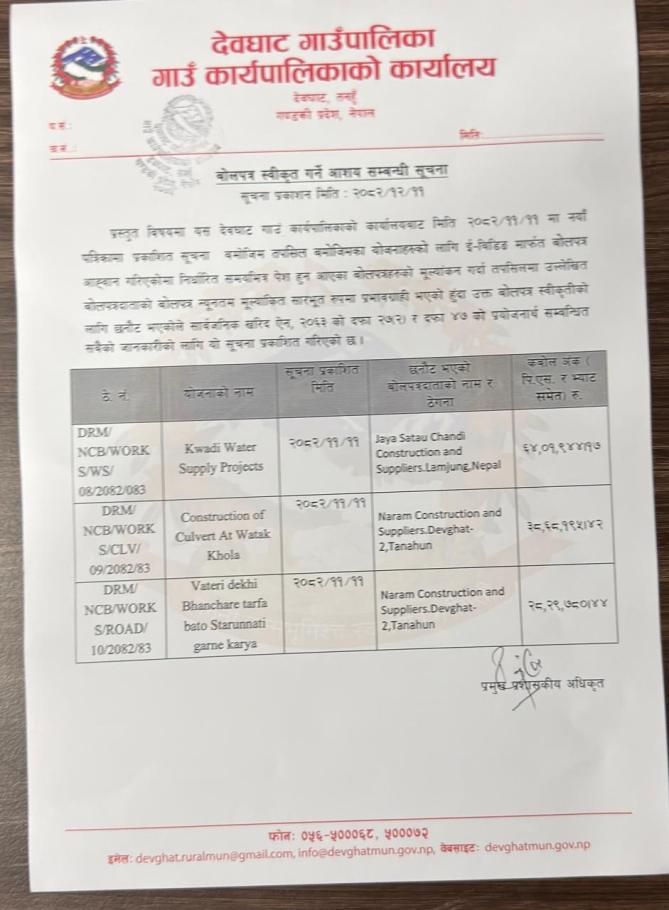 बोलपत्र स्वीकृत गर्ने आशय सम्बन्धी सूचना !