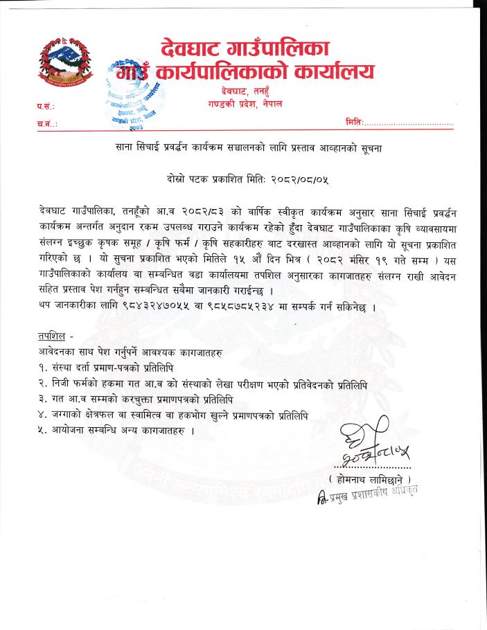 साना सिँचाई प्रवर्द्धन कार्यक्रम सञ्चालनको लाहि प्रस्ताव आव्हानको सूचना