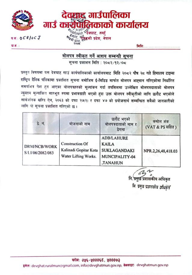 बोलपत्र स्वीकृत गर्ने आशय सम्बन्धी सूचना !