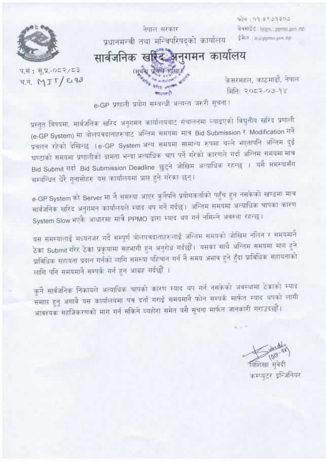 सार्वजनिक खरिद अनुगमन कार्यालयको e-GP प्रणाली प्रयोग सम्बन्धी अत्यन्त जरुरी सूचना