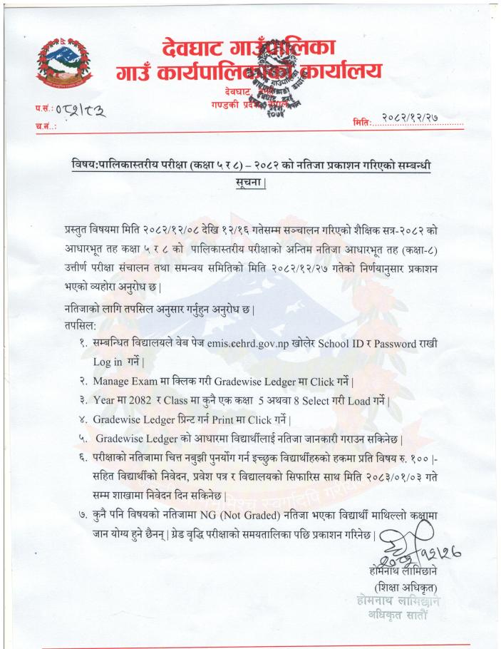 पालिकास्तरीय परीक्षा (कक्षा ५ र ८) - २०८२ को नजिजा प्रकाशन गरिएको सम्बन्धी सूचना !